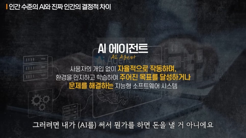 기업과 투자자들이 원하는 건 지금 당장 돈이 되는 AI이기 때문입니다. 에이전트란 특정 목표를 위해 자동으로 일하는 AI를 말합니다.