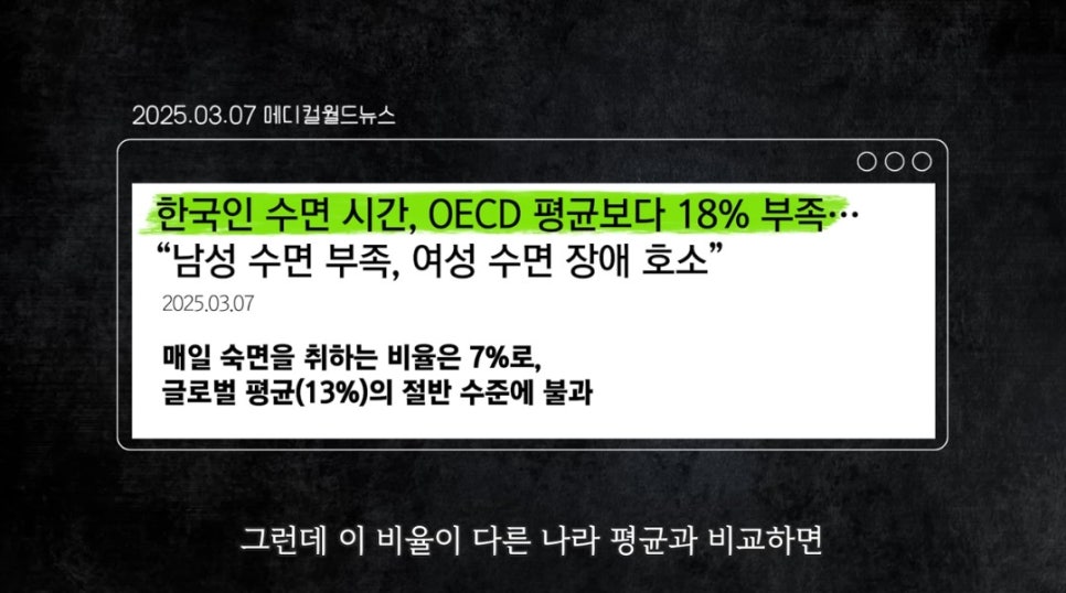 OECD 조사에 따르면 한국인의 매일 숙면 비율은 고작 7%로, 다른 나라 평균의 절반 수준에 불과합니다.