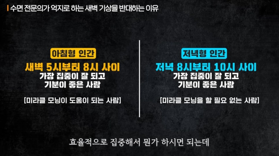 요즘 유행하는 ‘미라클 모닝’도 그래요. 자신이 아침형이 아닌데 억지로 일찍 일어나면, 몸은 망가지기 시작합니다.