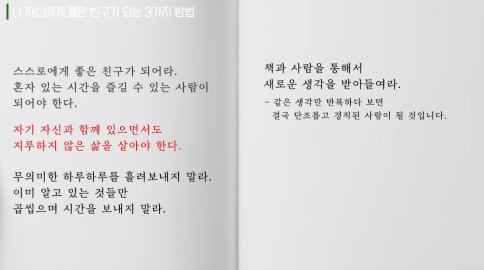 만약 그런 친구가 없다면, 책 속의 멘토를 만나세요. 나와의 대화, 책과의 대화, 그것만으로도 충분히 성장할 수 있습니다.