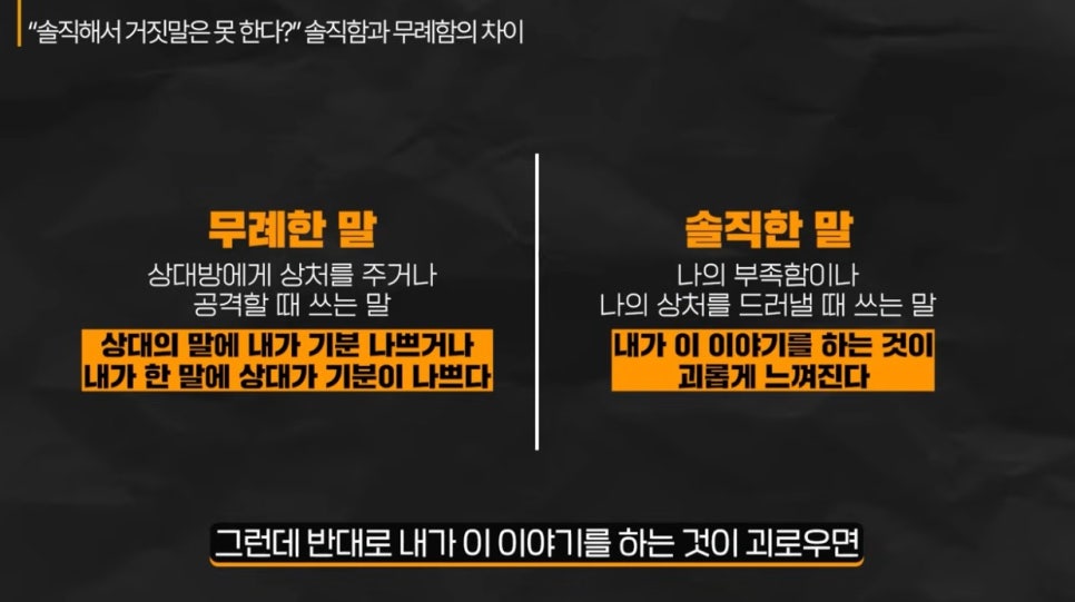무례한 말은 상대를 공격하거나 상처 주는 말이고, 솔직한 말은 나의 부족함과 아픔을 드러내는 용기 있는 말입니다.