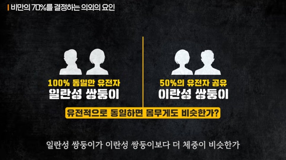 쌍둥이 연구에서도 유전적 요인이 체중에 큰 영향을 미친다는 결과가 나왔죠.
