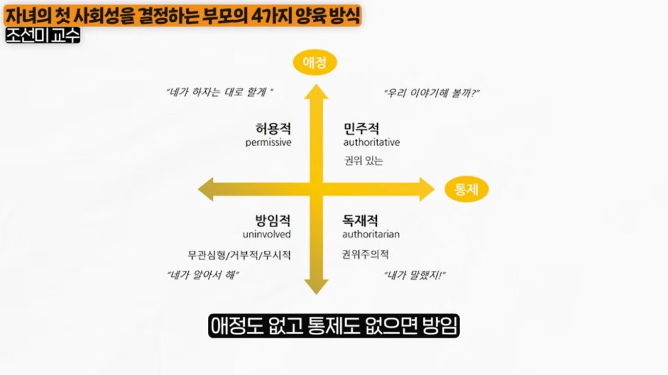 양육 태도는 예전처럼 허용과 통제를 한 줄로 보는 게 아니라 애정과 통제, 두 개의 독립된 축으로 봐야 합니다.
