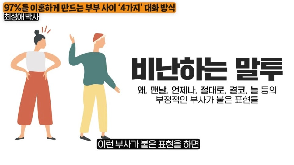 비난은 ‘항상, 맨날, 도대체’ 같은 공격적 부사에서 시작되고, 그 공격을 받은 사람은 결국 방어하거나 역공을 하게 되죠.