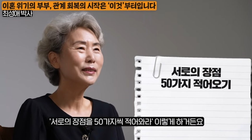 그래서 저는 관계가 틀어진 부부의 회복을 위해 첫 과제로 장점 50개 쓰기를 제안합니다.